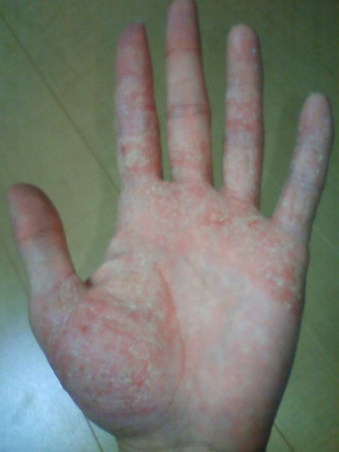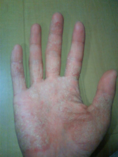 かわりに ・エバメール ・ワセリン ・ベビーローション ・バッチフラワー レメディ レスキュークリーム 等で保湿のみによる治療を続けておりました。 手のアカギレやガサガサはそこまでではなかったものの、 「保湿がきれるとすぐガサガサになる。」 「水泡がやまない」 「赤みがひかない」 など、症状が一向に収まらず、手には綿製の手袋をはめ、保湿剤を持ち歩くような生活をしていました。 そんななか佐藤健二先生の冒頭の講演を契機に、すべてやめてみることにしました。 先生のお話を自分なりに解釈して簡潔にいうと 「人間には自然治癒力がある。しかしながら保湿をすると皮膚本来の保湿力・バリアを 発揮しなくても守られるため、皮膚が保湿剤に頼るようになる。すべてやめればもちろん最初は 悪化していくが、ピークを過ぎれば自然治癒力が回復し、快方に向かうことになる。」 といったものでした。 といっても、なかなか勇気が持てず、一気には止められなかったので、 「一番症状の軽い所からやめる」 「保湿を常にする状態」から「朝晩のみ」「エバメールのみ」「風呂上がりのみ」 と少しずつやめてきました。 そして、今日ようやく全部やめることができたので、今日から状況を報告していこうと思います。 今の状況は写真ではわかり辛いかもしれませんが、かなりガサガサ。 おまけにアカギレもかなりあちこちに・・・もちろん、常にではありませんが、かゆみもあります。 アカギレはもちろんいたく、しみるし手動かしづらくつらい状況ですが、今日から良くなることを 信じて保湿も薬もせずに経過を見てみたいと思います。 参考までに、佐藤先生の本「患者に学んだ成人型アトピー治療」を紹介します。